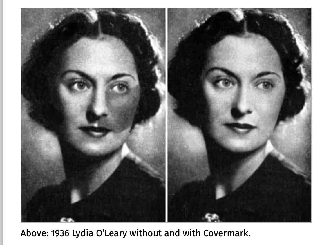 Lydia O'Leary (1900-1982) was the inventor of a highly-specialized foundation makeup designed to cover extreme birthmarks and discolorations. She received a patent for her invention in 1932. A version of her successful company, Covermark, is still in existence.