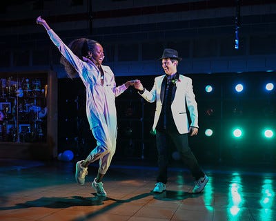But I was most taken by Richard's love interest, Ann Margaret, stupendously played by Zurin Villanueva. Like R3's Lady Anne, this Ann is initially seduced by the ways an alliance with Richard can promote her own interests; unlike Lady Anne, Ann has a developed back story and character arc. Ann and Richard's performance at the Sadie Hawkins dance (top) - for which they have practiced in a studio as they begin to know and understand each other (below) -- is glorious. And it makes his later betrayal of her that much more devastating. We don't really care when Lady Anne dies in R3 -- we don't know her very well, and she functions as merely another indicator of Richard's duplicity and violence. Playwright Mike Lew and Villanueva center TD's Ann to make a compelling and damaging statement about women in Shakespeare's plays and in culture at large, then and now.